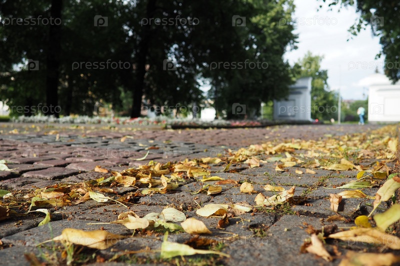 Петрозаводск, Карелия, Державинский парк. Приближение осени. Желтые листья липы и ивы катятся по мощеному тротуару на ветру. Люди идут по дороге. Входные ворота
