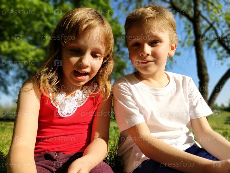 Двое детей сидят на лугу и разговаривают. Девочка 6 лет и мальчик 7 лет играют на улице в городском парке. Мальчик в белой футболке, девочка в красной футболке