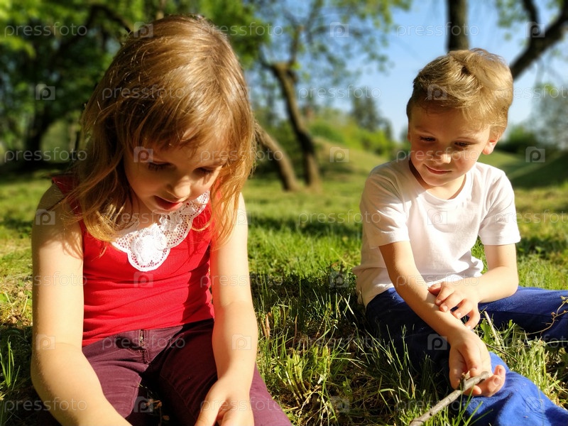 Двое детей сидят на лугу и скучают от безделья. Девочка 6 лет и мальчик 7 лет играют на улице в городском парке. Мальчик в белой футболке, девочка в красной футболке