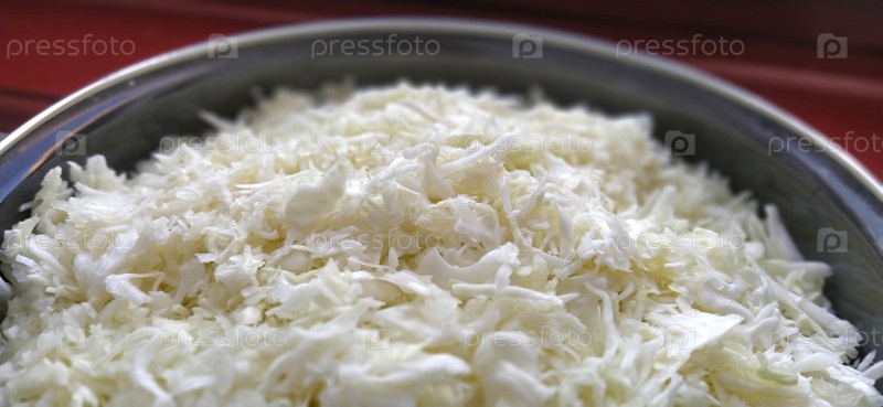 Нашинкованная белокочанная капуста в кастрюле. Крупный план салата из зеленых овощей. Приготовление витаминного вегетарианского салата из капусты. Мягкий фокус. Малая глубина резкости