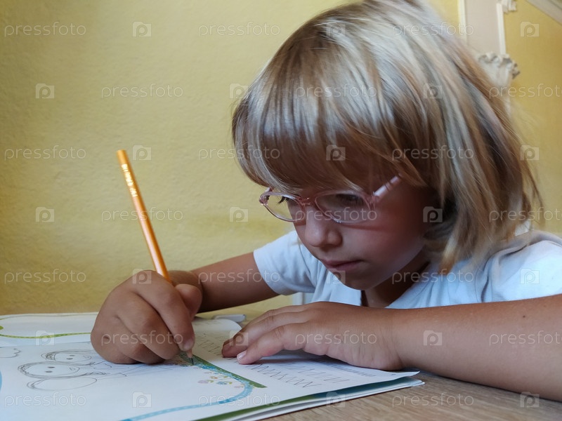 Девочка 6-7 лет читает книгу или учебник и улыбается. У ребенка светлые волосы, смуглая кожа и очки на лице. Ребенок сидит за партой. желтая стена на заднем плане