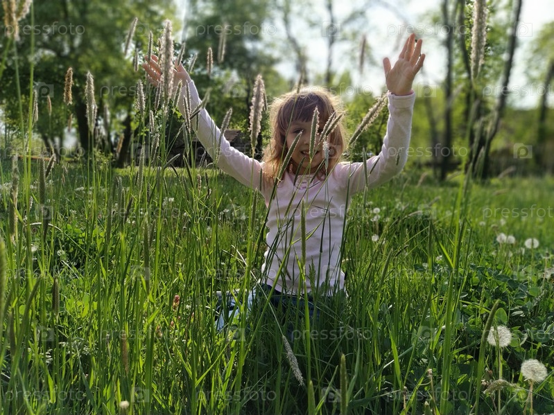 Веселая девочка играет в траве. Ребенок поднял руки. Девушка разбрасывает высокую траву руками и улыбается. Вечернее время на поле. Закат и солнечные лучи. Частично размыто