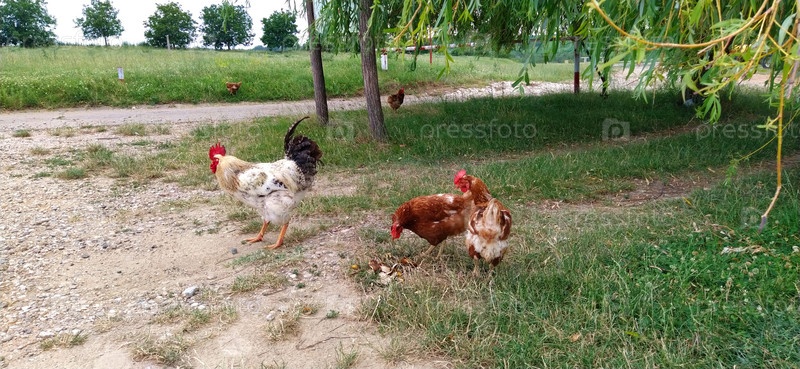 Курица свободного выгула на традиционной птицеферме. Три петуха ищут еду в траве. Одна белая курица и две курицы с коричневыми перьями. Три птицы