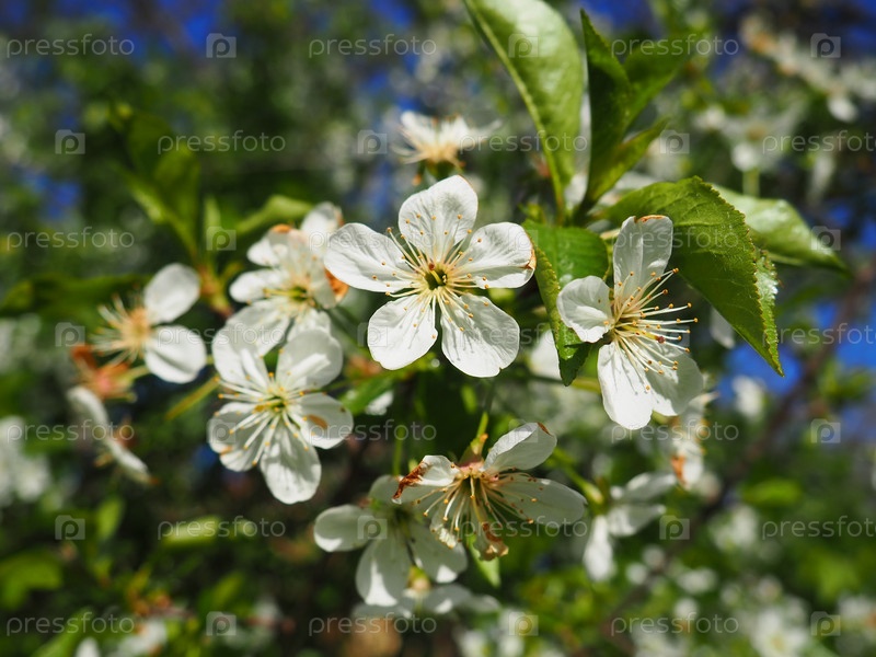Дерево, цветущее белыми цветами. Вишня, яблоня, слива или черешня в цветущем состоянии. Нежные белые лепестки. Очень красивый цветущий весенний сад