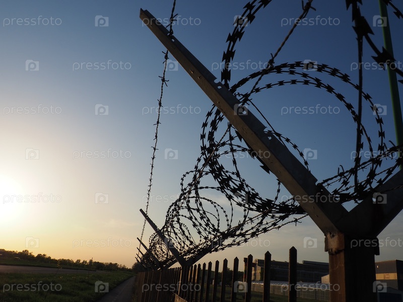 Колючая проволока в мотках и натянута на фоне голубого неба. Колючая проволока от воров и вандалов. Непреодолимое препятствие. Ржавая проволока, ряды, спираль и катушки колючей проволоки