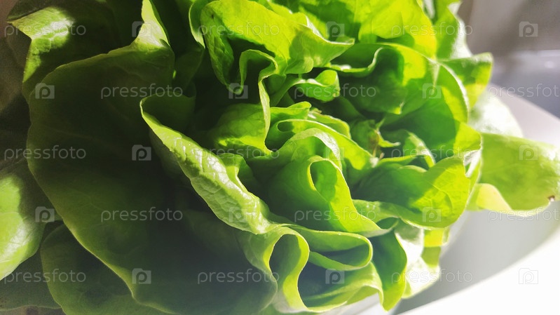 Салат в раковине. Зеленые листья освещены утренним солнцем. Диетический продукт для похудения и правильного питания. Витамины и минералы. Растение для потребления человеком