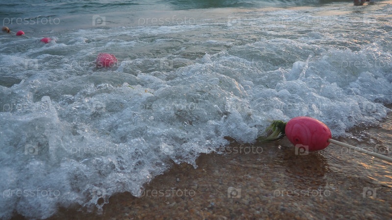 Буи на веревке у морской воды. Буи — это розовые ограничители, предупреждающие людей о глубине воды. Спасение утопающих. Разграничение места на песчаном пляже между отелями. Волна с пузырьками