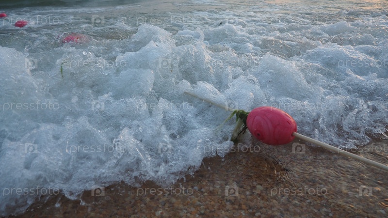 Буи на веревке у морской воды. Буи — это розовые ограничители, предупреждающие людей о глубине воды. Спасение утопающих. Разграничение места на песчаном пляже между отелями. Волна с пузырьками