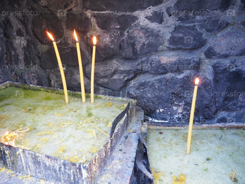 Горящие свечи для мира или здоровья. Церковный религиозный обряд. Три свечи слева на подставке, одна свеча справа. Расплавленный воск в металлическом контейнере. Каменный фон