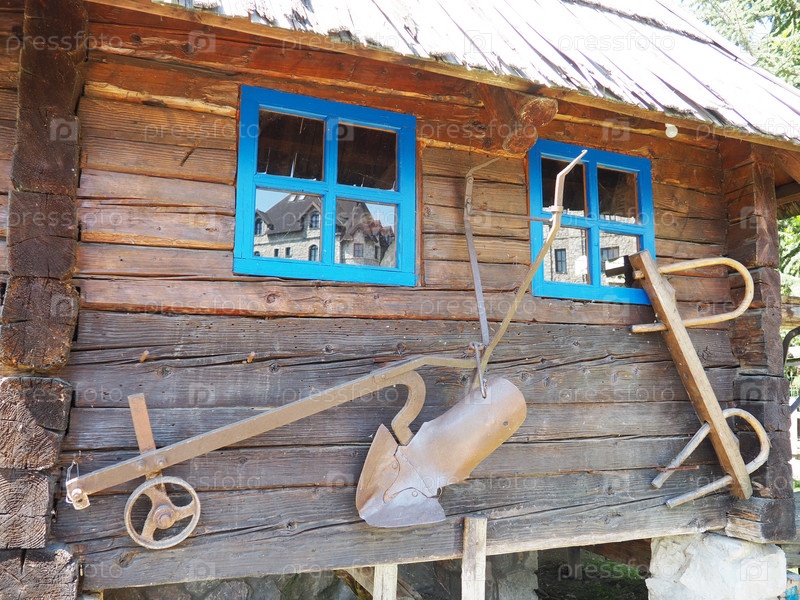 Станишичи, Биелина, Босния и Герцеговина, 25 апреля 2021 г. Деревянный деревенский дом Традиционное боснийское горное жилище XIX века Реставрированные этнопостройки, орудия сельскохозяйственного труда