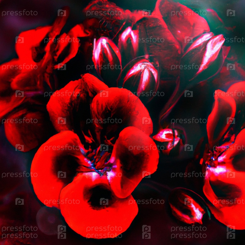 Герани пеларгонии красные, яркие цветы на черном фоне. Абстрактная стилизованная иллюстрация, поздравительная открытка или этикетка для аромата эфирного масла пеларгонии