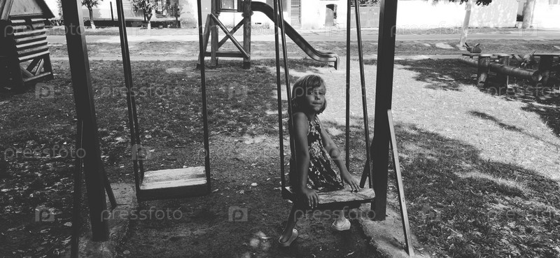 Красивая маленькая девочка сидит на качелях и смотрит в камеру. Ребенок 6 лет в платье на детской площадке. Монохромное изображение. Ретро стиль. Черно-белая фотография