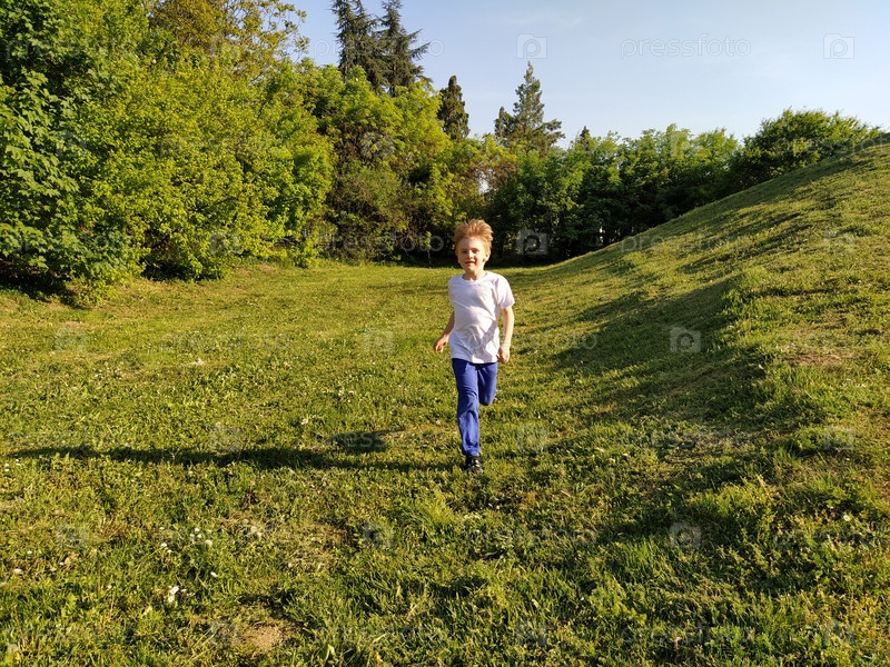 Ребенок бегает в парке. Мальчик в белой футболке и синих брюках. Зеленый газон или поле. Скошенный газон. Гулять и играть в лесу. Активные занятия спортом