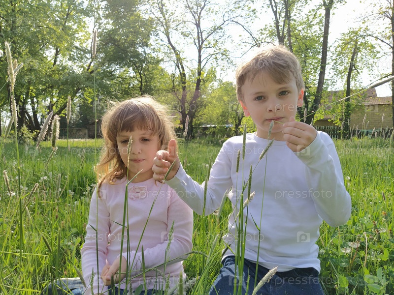 Дети играют в траве, собирают растения и цветы, пробуют траву на вкус и балуются. Левочка и мальчик, брат и сестра, веселятся. Концепция семьи. Аллергия на цветущие растения