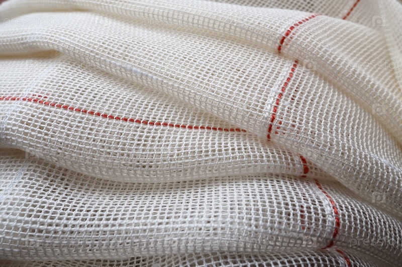 Белые грубые хлопчатобумажные или льняные шторы из переплетений тонких нитей. Простой компактный экономичный интерьер квартиры. Оформление окна в комнате. Красная полоса. Ткань сложена мягкими волнами