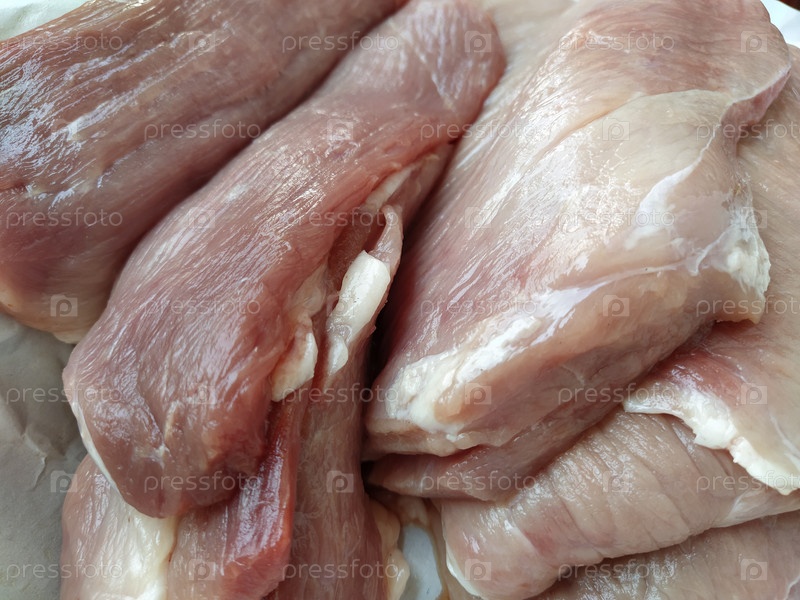 Куски мяса. Сырая свинина. Мелкие прожилки и текстура мяса. Розовое мясо с более темными красными участками. Продажа свежих мясных продуктов. Ассортимент продуктового магазина