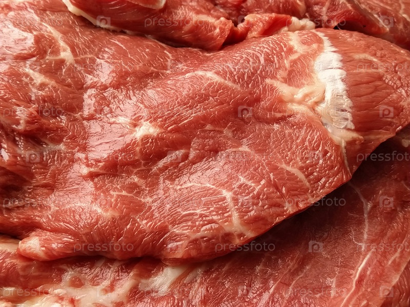Крупный план свежего говяжьего мяса. Большой кусок сырого мяса. Крупный план мясных волокон. Здоровое белковое питание. Телятина. Высококачественный белок и питательные вещества. Бычье мясо