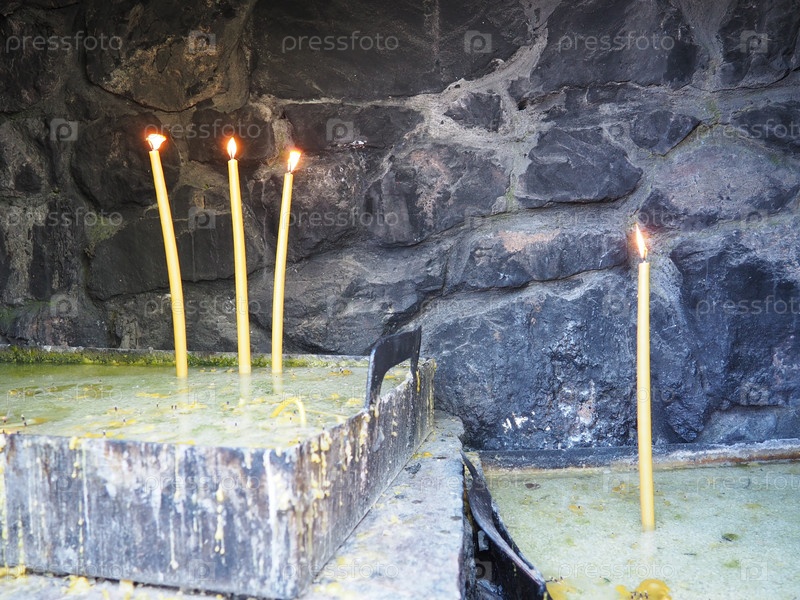 Горящие свечи для мира или здоровья. Церковный религиозный обряд. Три свечи слева на подставке, одна свеча справа. Расплавленный воск в металлическом контейнере. Каменный фон