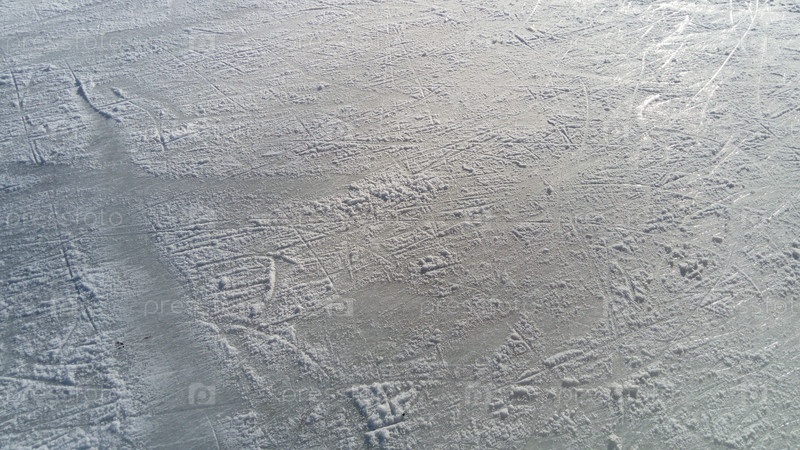 Лед с прожилками от кончиков коньков. Фигурное катание на льду. Поверхность ледовой арены после тренировки фигуристов. Солнечный луч на мокром весеннем льду. Снег и замерзшая вода