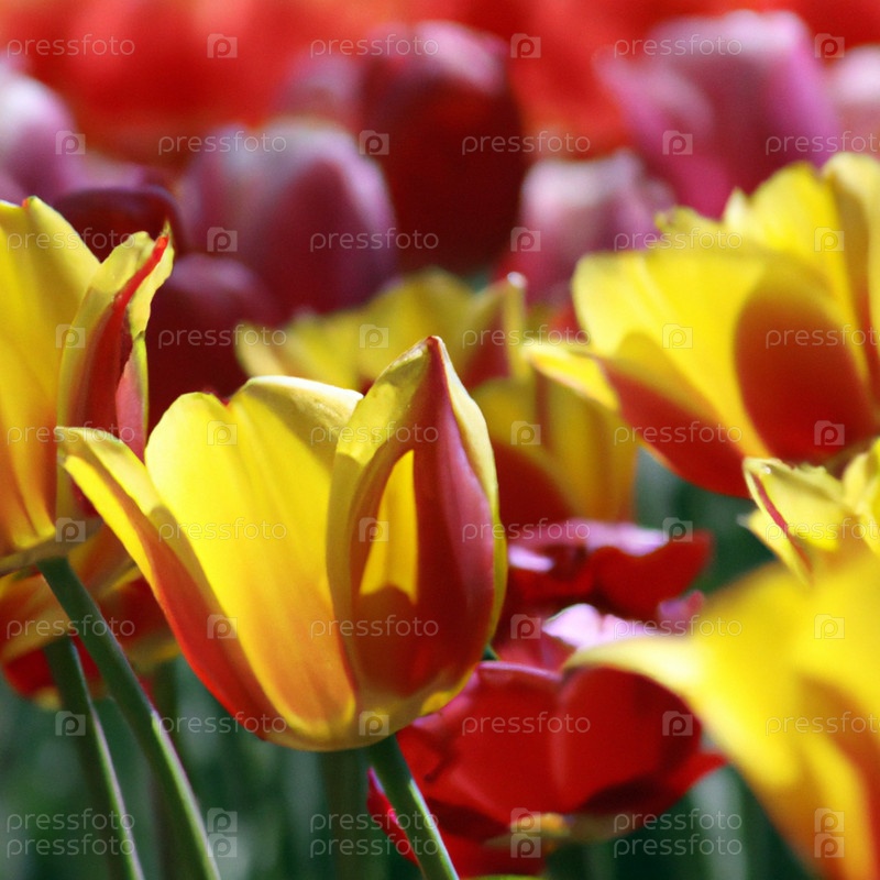 Тюльпан Tulipa, луковичные травы семейства лилейных Liliaceae. Выведены тюльпаны, садовые цветы, сорта и разновидности. Цветки нежные желто-фиолетовые. Красивые бутоны. Ландшафтный дизайн, клумба