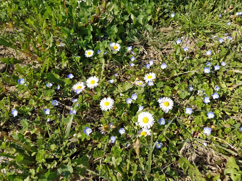 Белые ромашки на лужайке в весенний день. Короткие стебли, только зеленая трава, выходящая из земли. Первые весенние шаги. Лужайка с цветами. Почва с глиной. Крупный план. Зеленая трава и листья клевера