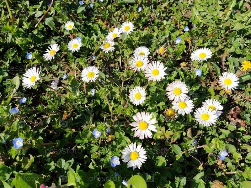 Белые ромашки на лужайке в весенний день. Короткие стебли, только зеленая трава, выходящая из земли. Первые весенние шаги. Лужайка с цветами. Почва с глиной. Крупный план. Зеленая трава и листья клевера