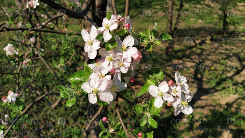 Нежные лепестки цветка яблони. Яблони в пышных цветущих белых цветах. Заметны пестики и тычинки. Весна в саду. Начало сельскохозяйственных работ