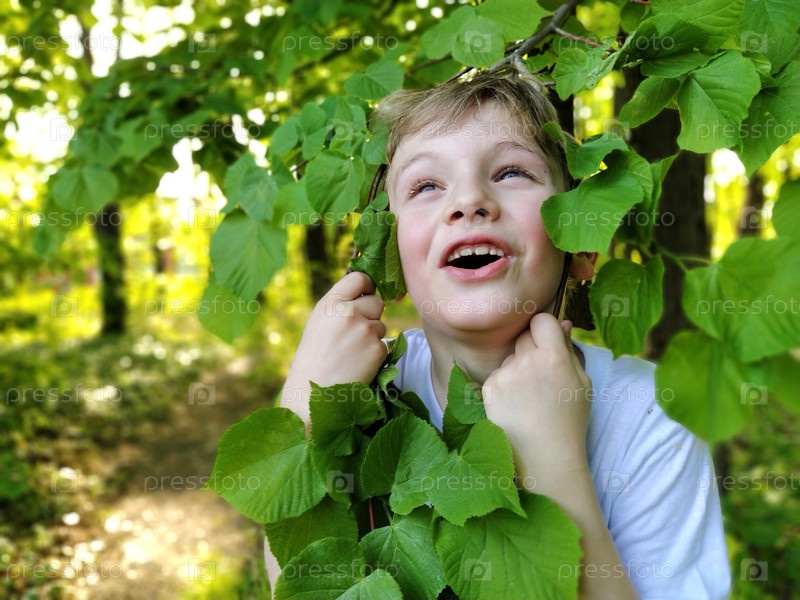 Белокурый мальчик держит руками ветки липы. Ребенок улыбается. Молочные зубы уступили место коренным. Стоматологическая тема. Школьнику 7 лет. Малыш в белой футболке. Широкая улыбка с зубами. Красивое лицо