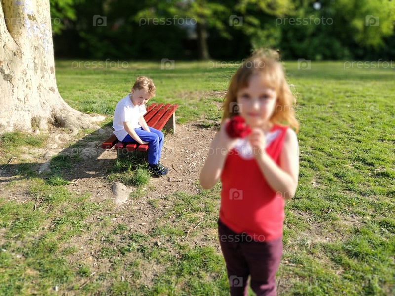 Мальчик влюблен в девушку. Первая несчастная любовь. Частично расфокусированное фото. Мальчик на скамейке закрыл глаза от красоты девушки или от разочарования. Эмоции и жесты
