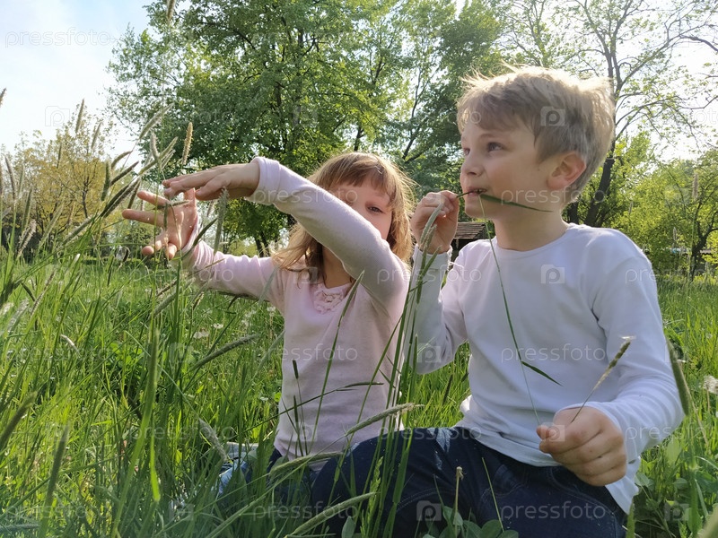 Дети играют в траве, собирают растения и цветы, пробуют траву на вкус и балуются. Левочка и мальчик, брат и сестра, веселятся. Концепция семьи. Аллергия на цветущие растения