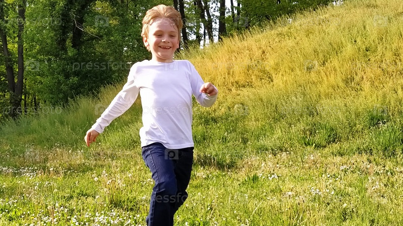 Мальчик бежит по траве. Малыш вспотел. Ребенок в белой блузке и синих джинсах