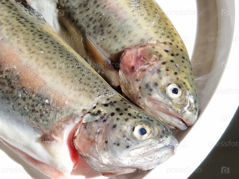 Две форели на белой тарелке. Свежая съедобная рыба крупным планом. Блестящая чешуя на теле, прозрачные глаза рыбки. Высокое содержание ненасыщенных жирных кислот омега-3 для здорового питания. Средиземноморская диета