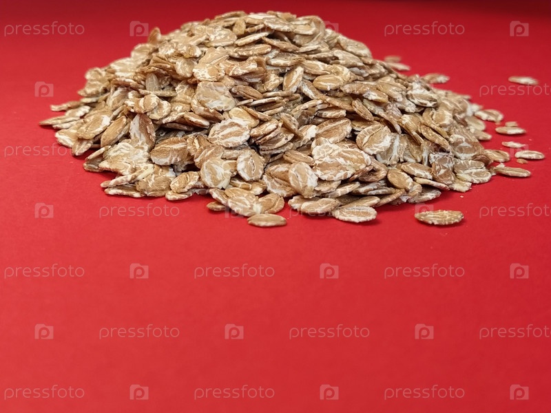 Ржаные хлопья на красном фоне. Концепция здорового питания и вегетарианства