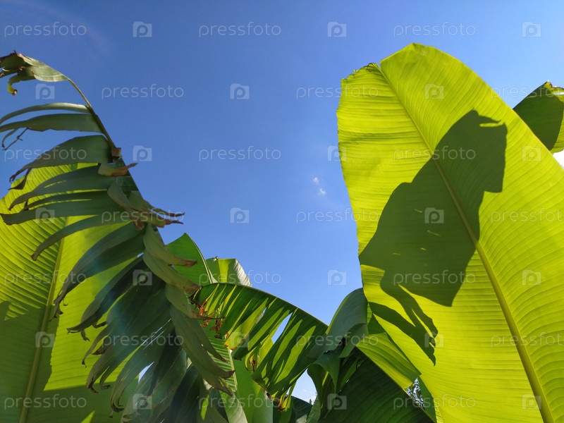 Зеленый банановый лист в природе, банановый лист и небо