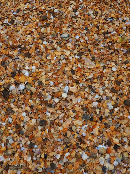Раковины брюхоногих двустворчатых моллюсков, обитающих в Азовском и Черном морях. Бежевые, коричневые, черные, белые ракушки на берегу. Деревня Голубицкая. Сломанные маленькие ракушки