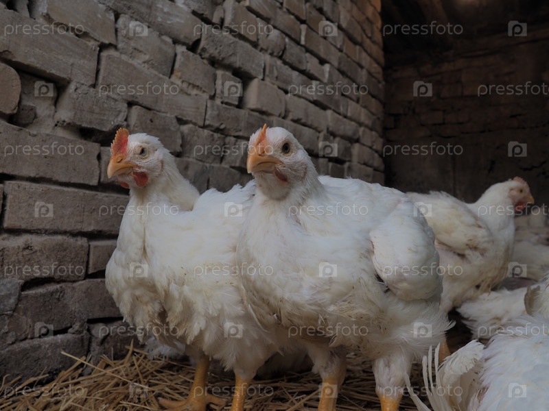 Ферма белых кур, настоящие пейзажи. Куры в деревенском сарае. Разведение птицы для производства яиц и мяса. Птицеводство и животноводство. Многие птицы сидят и ходят