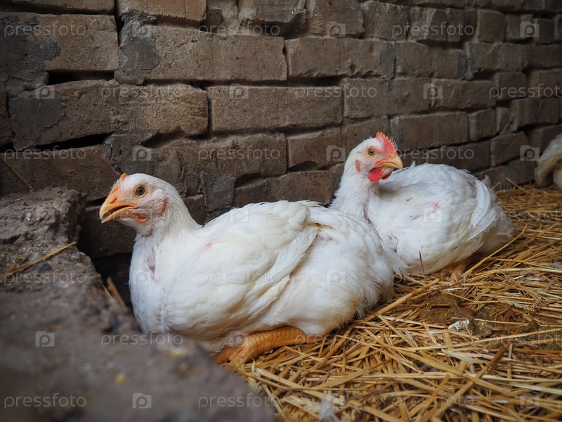 Ферма белых кур, настоящие пейзажи. Куры в деревенском сарае. Разведение птицы для производства яиц и мяса. Птицеводство и животноводство. Две птицы сидят