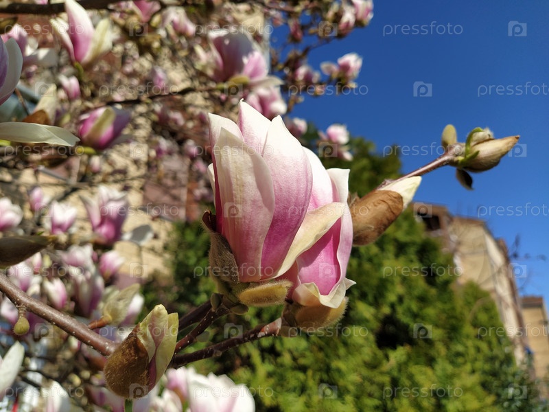 Красивые цветущие розовые цветы и бутоны магнолии на ветвях без листьев. Голубое небо и солнечный свет. Приглашение на свадьбу или открытка с 8 марта. Начало весны. Нежные белые лепестки