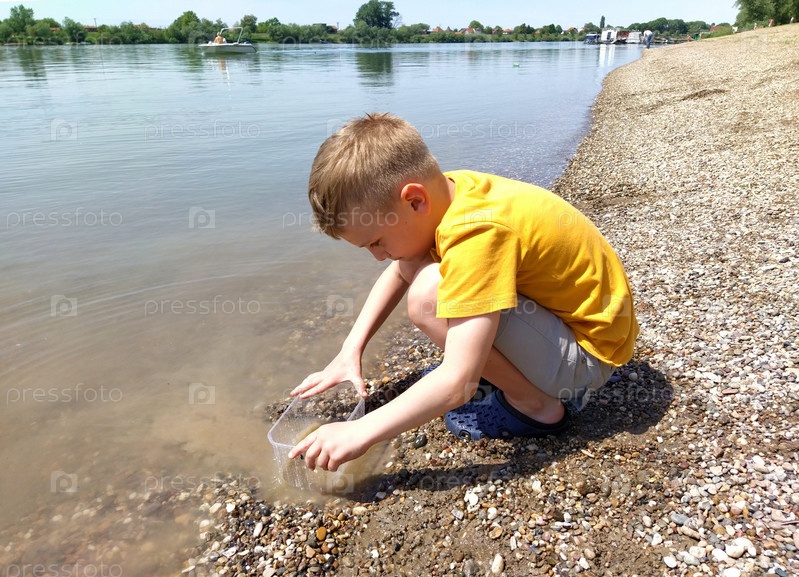 Молодой милый мальчик, играющий в воде в красивой реке в солнечный летний день