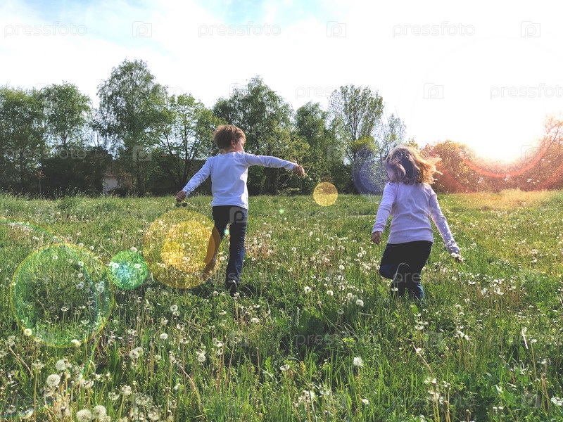 Дети бегут по полю. Сельские пейзажи под сияющим солнечным светом. Дети в белых рубашках и джинсах. Момент движения на бегу. Волосы девушки развеваются на ветру. Блики солнца