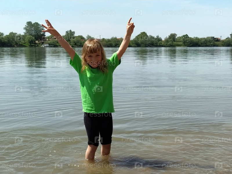 Девочка 6-7 лет играет с водой в реке. Ребенок одет в зеленую футболку и черные шорты. Лето на пруду. Счастливая девушка подняла руки вверх. Ребенок смеется