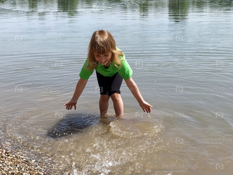Девочка 6-7 лет играет с водой в реке. Ребенок одет в зеленую футболку и черные шорты. Лето на пруду. Хэппи наклонилась и касается воды руками. Ребенок смеется