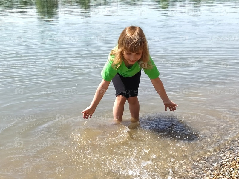 Очаровательная кудрявая девочка плещется в красивой реке в солнечный летний день. Ребенок одет в зеленую футболку и черные шорты