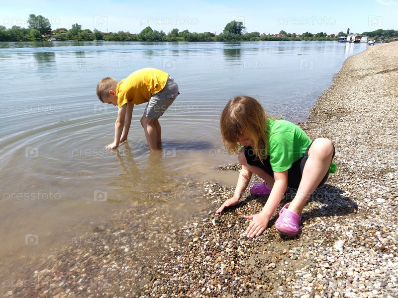 Мальчик и девочка играют на пляже. Дети играют с водой, песком и галькой на берегу реки. Дети одеты в футболки. Брат и сестра со светлыми волосами. Дети 6 - 7 лет