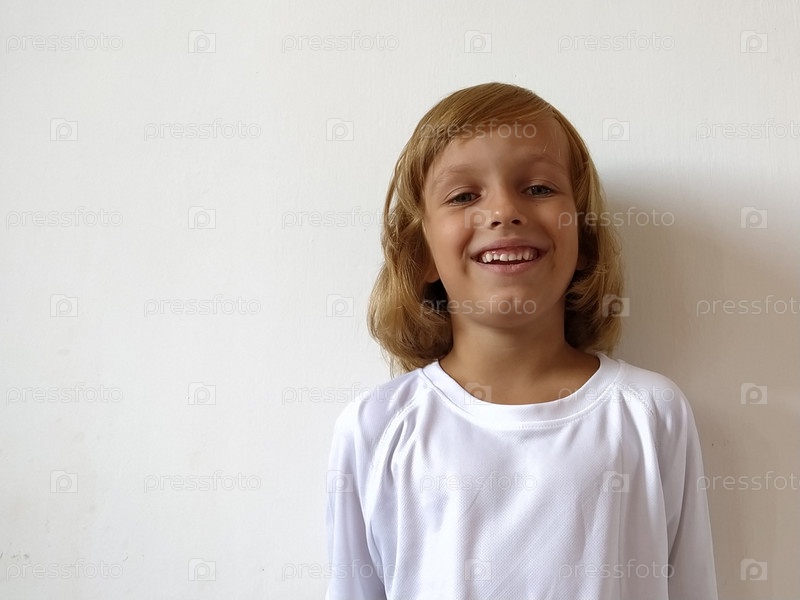 Маленькая красивая девочка 6-7 лет со светлыми волосами выражает эмоциональную радость и улыбку на белом фоне. Ребенок с загорелой кожей. Белая футболка. Скопируйте пространство