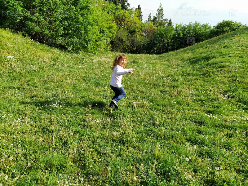 Девушка бежит по полю с подстриженной зеленой травой. ребенок одет в белую блузку и синие джинсы. Летний вечер. Детские забавы. Девушка с длинными светлыми волосами