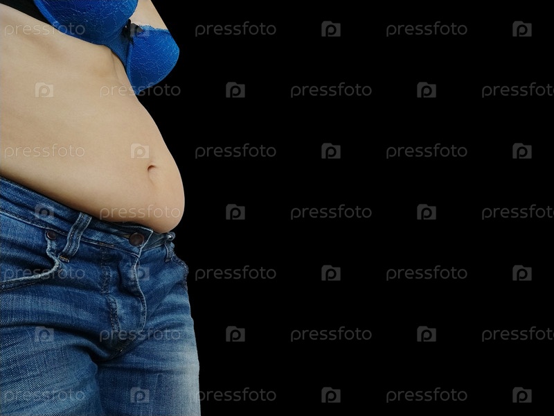 Обвисший живот. Складки кожи и жира сбоку нависают над талией джинсов. Фигура, испорченная перееданием или беременностью. Ожирение и диабет. Черный фон. Целлюлит дряблых мышц