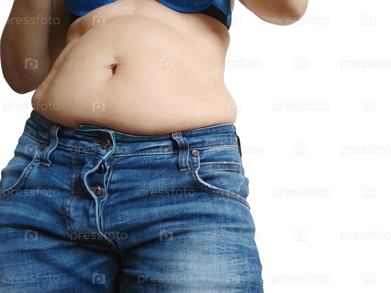 Обвисший живот. Складки кожи и жира по бокам нависают над талией джинсов. Фигура, испорченная перееданием или беременностью. Ожирение и диабет. Белый фон. Дряблые мышцы от целлюлита