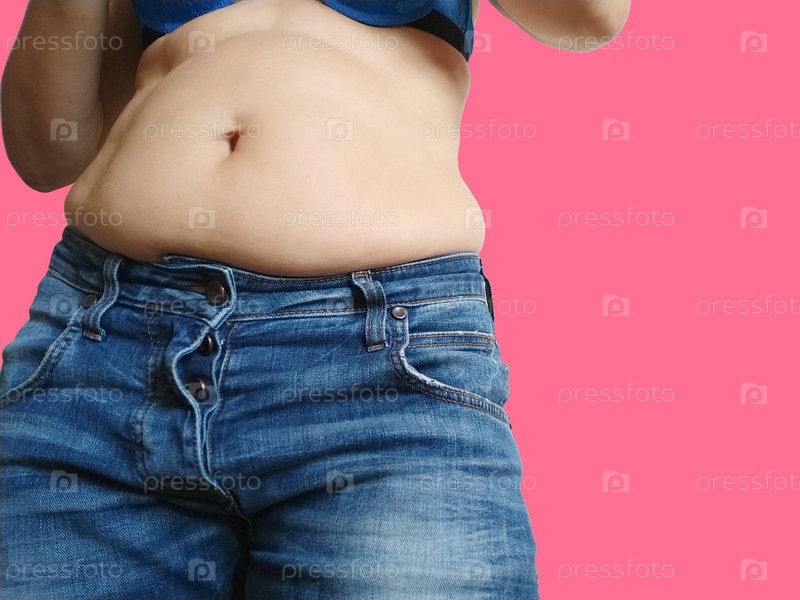 Обвисший живот. Складки кожи и жира сбоку нависают над талией джинсов. Фигура, испорченная перееданием или беременностью. Ожирение и диабет. Тихоокеанский розовый. Целлюлит дряблых мышц