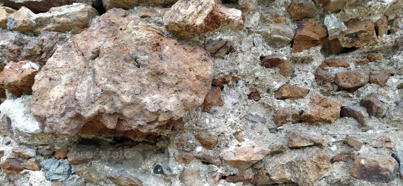 Каменная стена. Сложены крупные кирпичи и булыжники в теплых тонах. Рыхлые белые камни, выступающие над поверхностью стены